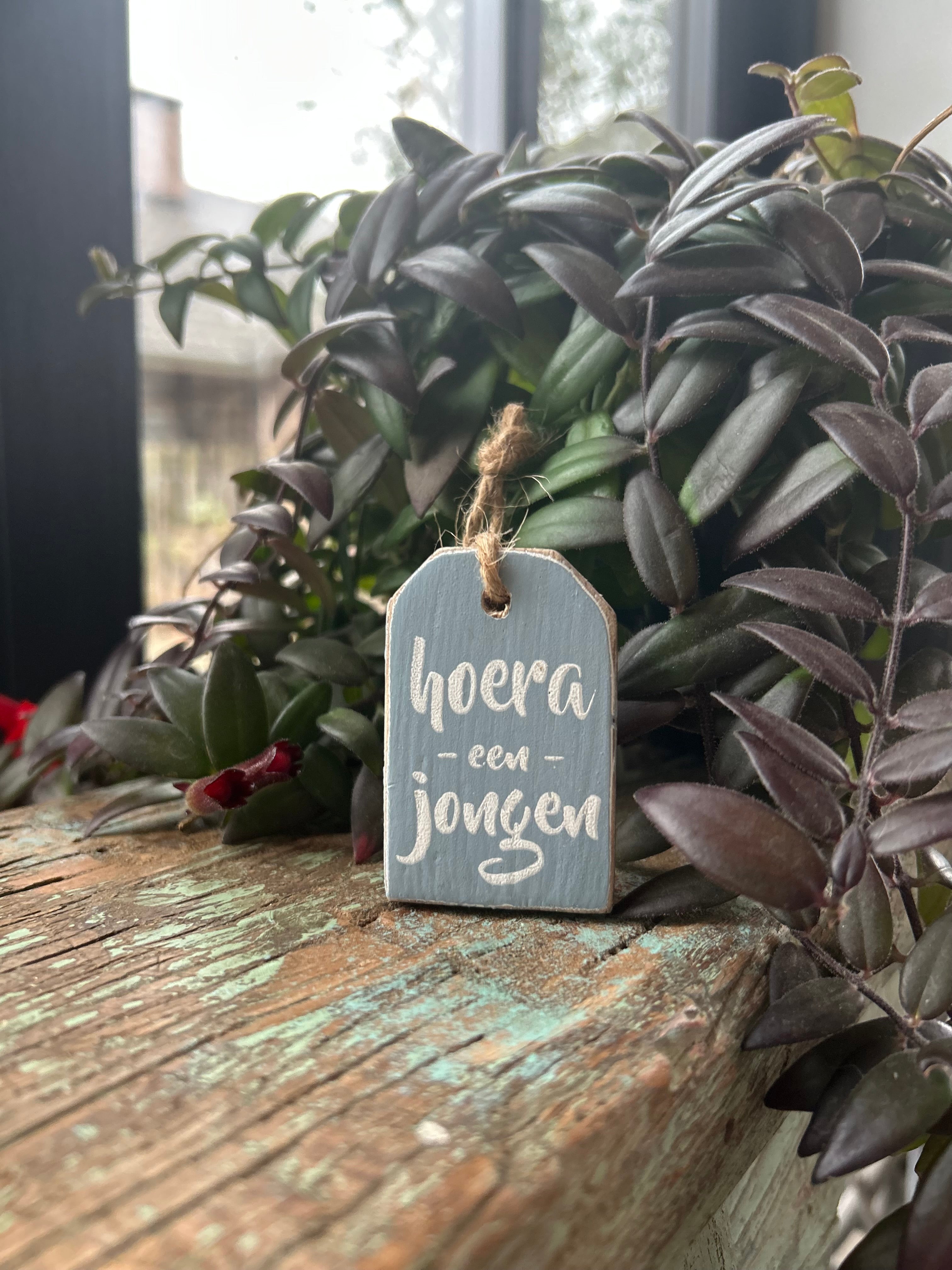 hanger label mini 6x4cm hoera een jongen baby blauw