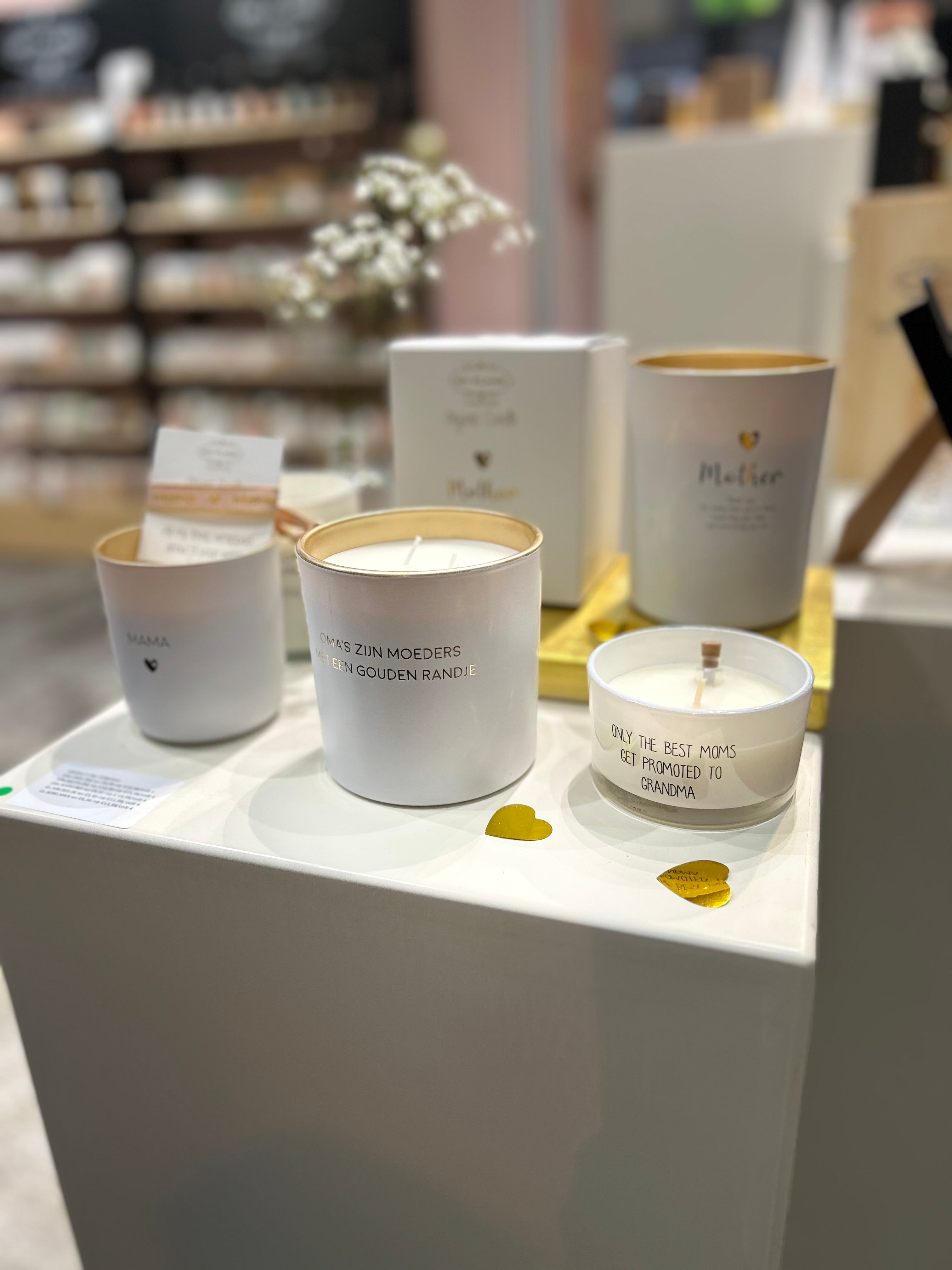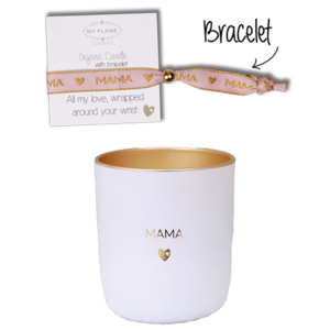 Een heerlijke geurkaars gemaakt van biologische sojawas. Deze kaars heeft de geur Fresh Cotton en brandt ca. 50 uur. Deze sojakaars wordt gesierd met de tekst 'Mama'. Een leuk detail aan deze kaars is dat het inclusief armbandje is met mama quote. Superleuk 2-in-1 cadeau voor Moederdag, verjaardag of zomaar voor de beste, liefste bonus moeder van de heeele wereld.
